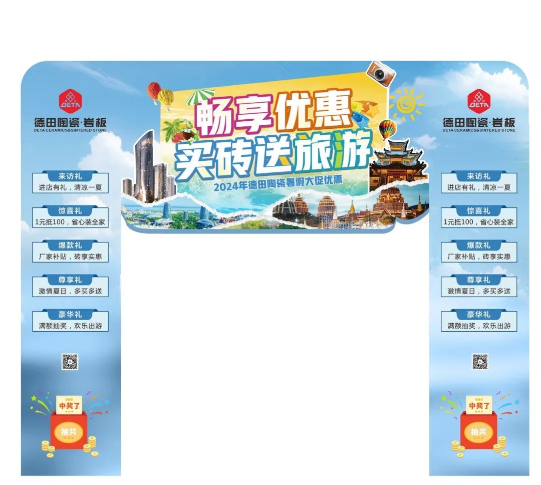 為了迎接暑期銷售旺季節(jié)點(diǎn),更好地配合廣大經(jīng)銷商家人們開展促銷活動(dòng),營造濃郁的促銷氛圍,搶占市場,德田陶瓷發(fā)起“暢享優(yōu)惠,買磚送旅游”暑期促銷活動(dòng),并推出系列促銷方案及物料,含拱門、單張、展架、貼紙等整套源文件。